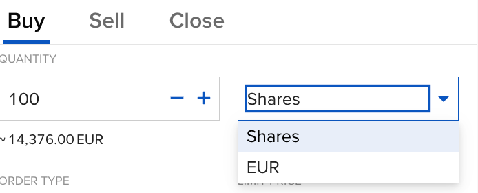 Quantity – vienetų skaičius, kiek nori pirkti/parduoti. Jeigu įjungta fractional shares, galima nurodyti tiesiog EUR sumą, ne kiekį.
