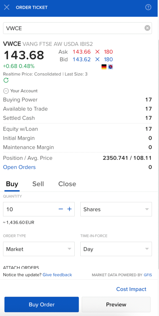Svarbu! Turint sąskaitoje 500 Eur ir perkant už lygiai 500 Eur gausite klaidą – IBKR sakys, kad nepakanka lėšų. Taip yra todėl, kad jie parezervuoja kiek daugiau, nes perkant už Market nežino nei už kiek, nei per kurią biržą pavyks nupirkti. Todėl aš asmeniškai tiesiog esu palikęs apie 50 Eur IBKR sąskaitos balanse ir tiek. Persivedu 1k, perku už 1k. Rezervuoja apie 5% daugiau, tai turint 500 už 500 nenusipirksi, reikia vesti kokius 470-480 Eur.