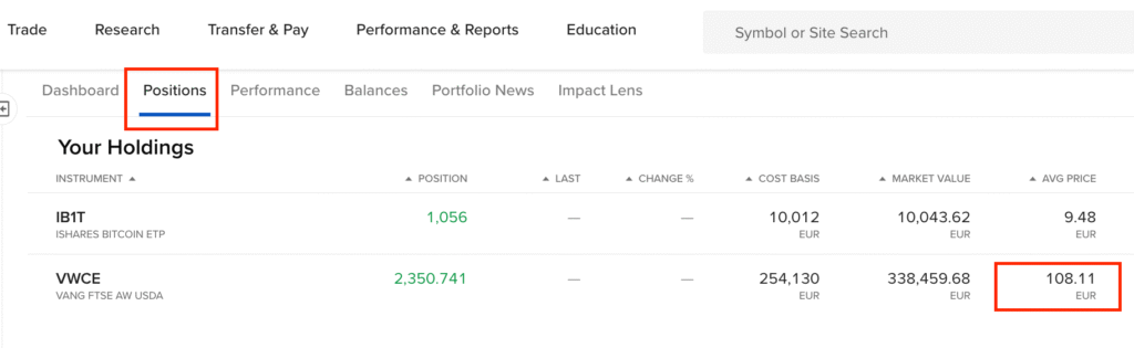 Portfolio → Positions: čia matai VWCE vienetus, Average Price (vidutinė kaina), Unrealized P/L (neįgyvendintas pelnas/nuostolis).