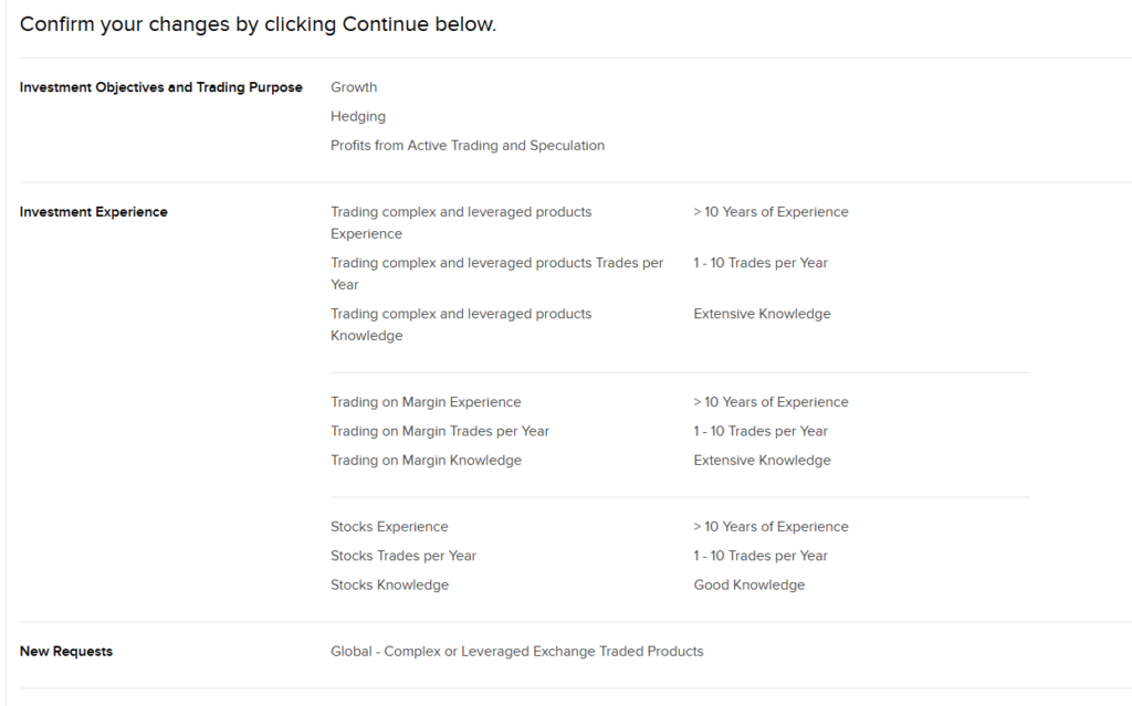 5. Atsidariusioje lentelėje supildau savo patirtį – nežinau tiksliai reikalavimo, reikia arba 5 arba bent 10 metų patirties, norint gauti prieigą (visgi tai baisūs, kompleksiški ir išvestiniai kripto produktai, haha). Niekas to niekaip netikrins, čia yra jūsų pačių vertinimas, tai norint prieigos prie kripto, reikia pildyti kažkaip taip: