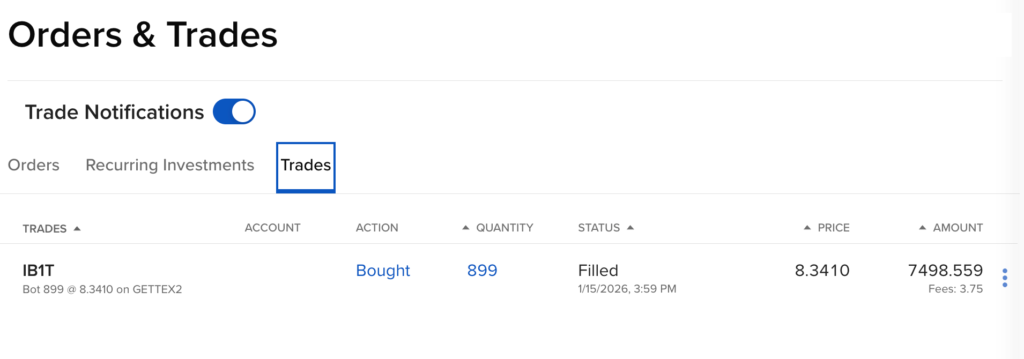 Deja, IB1T pirkti automatu per Recurring Investments neleidžia, nes tai neva yra sudėtingas finansinis produktas ir jam negalioja fractional shares. Gerai, kad jo vieneto kaina kol kas yra apie 8 Eur, tai ne bėda pirkti pilnus vienetus. Ką padarysi dėl to automatizavimo, kol kas papirkinėsiu rankomis.