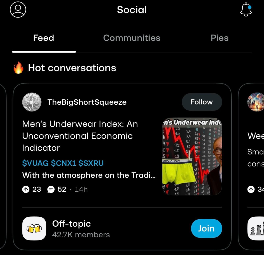 Arba vienu mygtuku prieinamas hot conversations feed’as apie visokias meme stocks ar finansines naujienas: