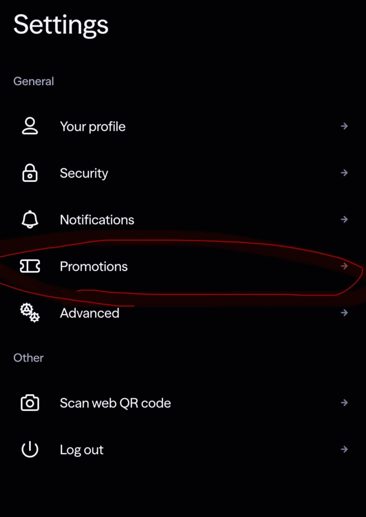 Galite registruotis tiesiai per mano nuorodą, kur tas kodas turėtų būti pritaikomas automatiškai (bet ne faktas, tai tikrinkite) ar per kokią norite nuorodą, o nuėjus į nustatymus yra vieta PROMOTIONS.