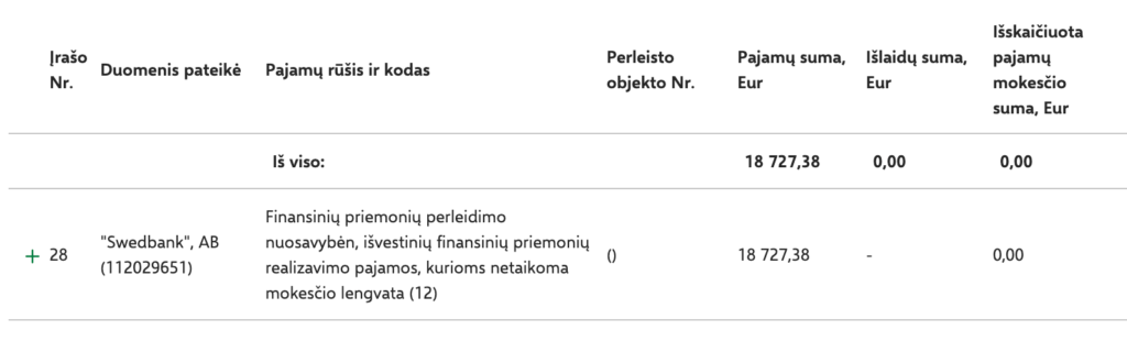 | Pajamos iš akcijų/ETF | 500 Eur | Iki 500 Eur pajamos neapmokestinamos ir deklaruoti nereikia. Pozicijos susidengia viena su kita. |